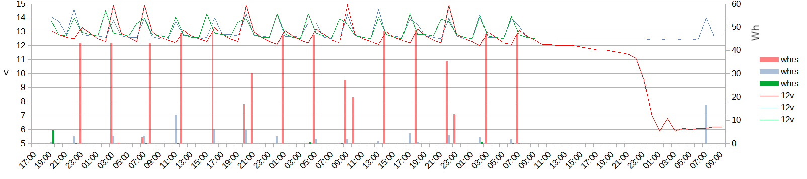The graph below shows the instance where the 12v battery failed (red) and 2 instances where it was OK (green & blue).